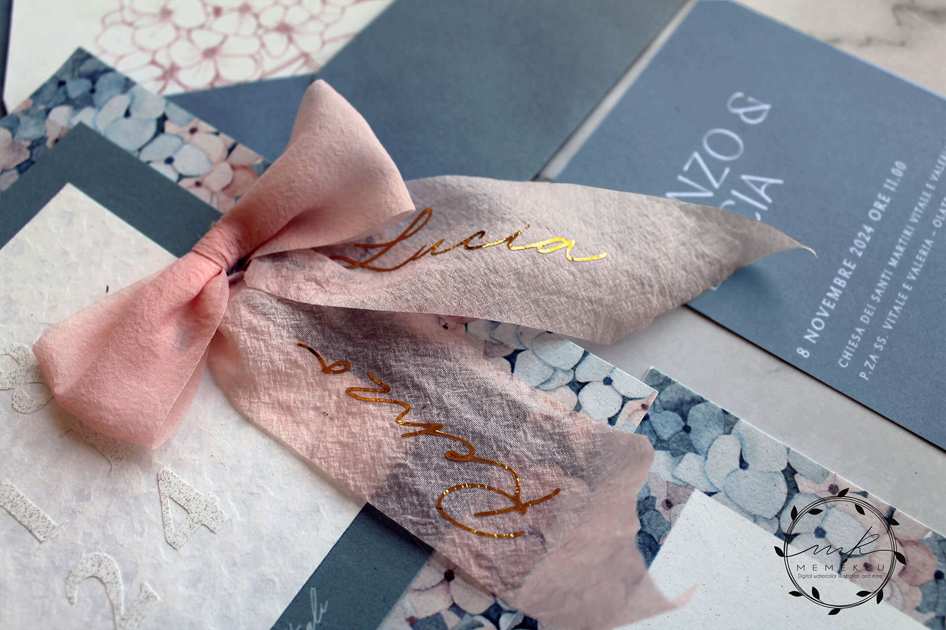 Per chi desidera un matrimonio raffinato e romantico, il set “Ortensie d’Incanto” è la scelta perfetta. Ispirato alla delicatezza delle ortensie e arricchito da dettagli unici, questo coordinato si distingue per un design elegante e armonioso, con un perfetto equilibrio tra modernità e tradizione. La combinazione di carte pregiate, accenti glitter e illustrazioni ad acquerello rende ogni elemento un piccolo capolavoro di stile.
